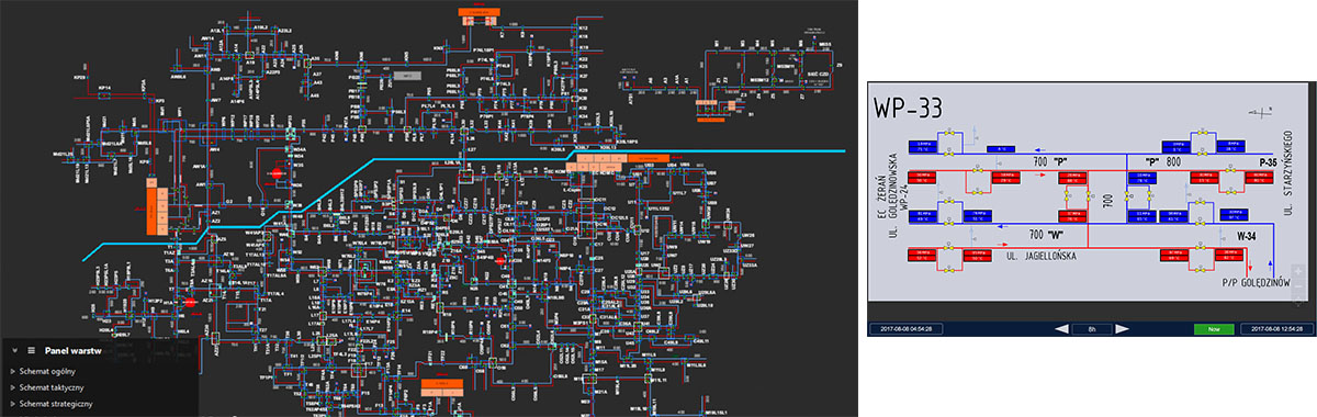 Schemat strategicznej sieci ciepłowniczej (schemat podstawowy), to schemat, na którym dyspozytor widzi między innymi główne komory magistralne z armaturą. Stan armatur przedstawiony na schemacie jest rejestrowany w centralnym repozytorium danych, a poprzez integrację z systemem PI w każdej chwili możemy odczytać historyczny stan armatur w konkretnym dniu i konkretnej godzinie. Ze schematu podstawowego można wywołać schematy synoptyczne poszczególnych komór, na których prezentowane są dane czasu rzeczywistego, takie jak wyniki pomiarów ciśnień czy też temperatur (rysunek 5).