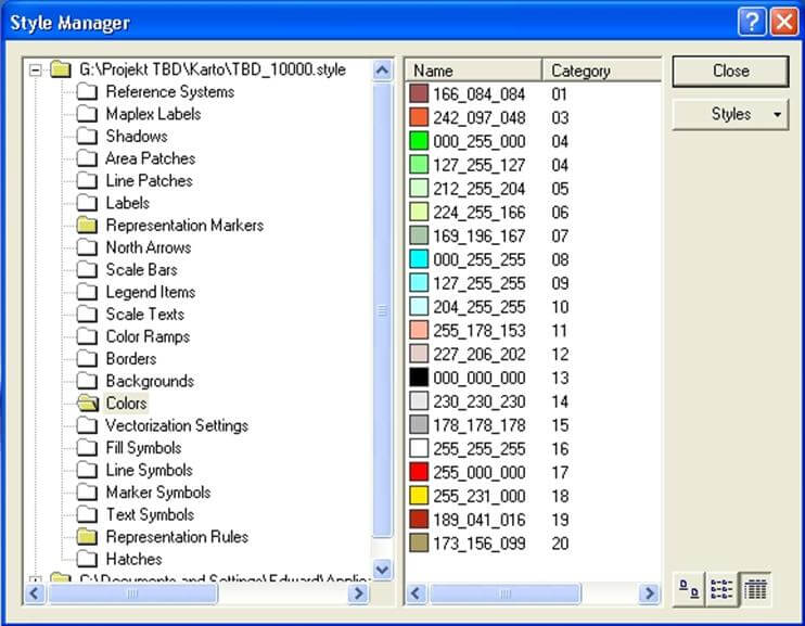 Należy zadbać o to, aby wynikowe kolory na mapie zgadzały się z wymaganiami. Aby uniknąć ręcznego wpisywania kodów kolorów przy definiowaniu każdego znaku kartograficznego, a przez to popełnienia możliwych i trudnych do wykrycia błędów, najlepiej wykorzystać możliwość definicji własnych kolorów w tablicy stylów.