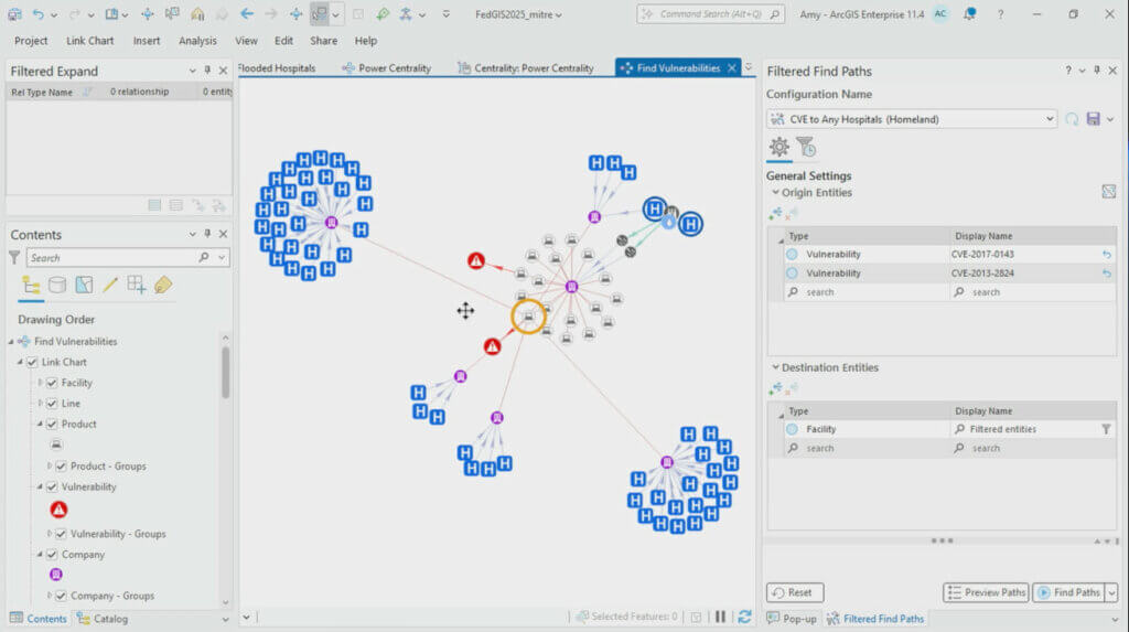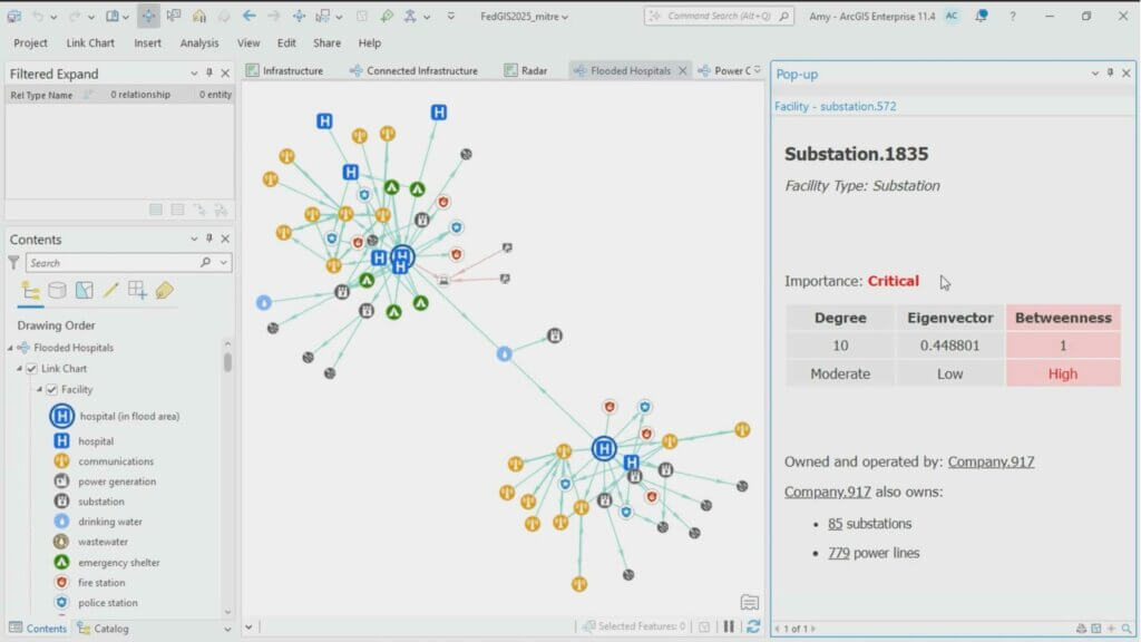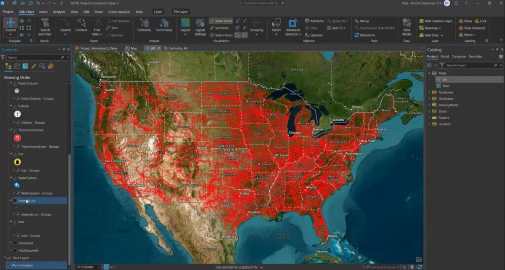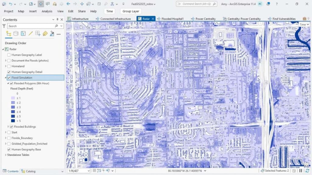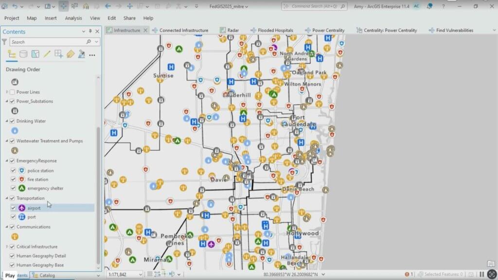 Właśnie takie podejście okazało się kluczowe dla powodzenia projektu Project Homeland. Zespół zebrał szczegółowe dane dotyczące infrastruktury krytycznej, a następnie wykorzystał narzędzia analizy zależności dostępne w ArcGIS Knowledge, aby zbadać, jak poszczególne elementy są od siebie zależne. Pozwoliło to ujawnić sieć podatności — od poziomu ogólnokrajowego po poziom lokalny. Przykładowo w Fort Lauderdale system potrafił pokazać, jak zalanie jednej stacji elektroenergetycznej w danej dzielnicy może zakłócić działanie oczyszczalni wody, szpitali oraz służb ratunkowych w całym regionie.