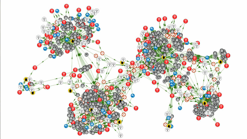Połączenie mapy i analizy relacji pozwala lepiej zrozumieć nie tylko infrastrukturę techniczną, ale także powiązania między ludźmi — na przykład wysoko wykwalifikowanymi pracownikami odpowiedzialnymi za jej utrzymanie. Analiza relacji pokazuje, kto z kim współpracuje, natomiast mapa wskazuje, gdzie te osoby pracują, a w niektórych przypadkach pozwala nawet śledzić ich położenie w czasie rzeczywistym.