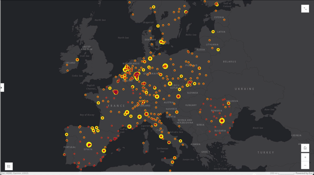 Informacje o zanieczyszczeniu hałasem w UE są dostępne m.in. w formie interaktywnej prezentacji w ArcGIS StoryMaps, przygotowanej przez Noise Observation and Information Service for Europe (NOISE) — projekt Europejskiej Agencji Środowiska. Narzędzie to przedstawia paneuropejski obraz hałasu, podzielony na cztery główne kategorie źródeł: ruch drogowy, kolejowy, lotniczy oraz działalność przemysłową. Użytkownicy mogą również przełączać widoki między mapami przedstawiającymi ekspozycję dzienną i wieczorną.