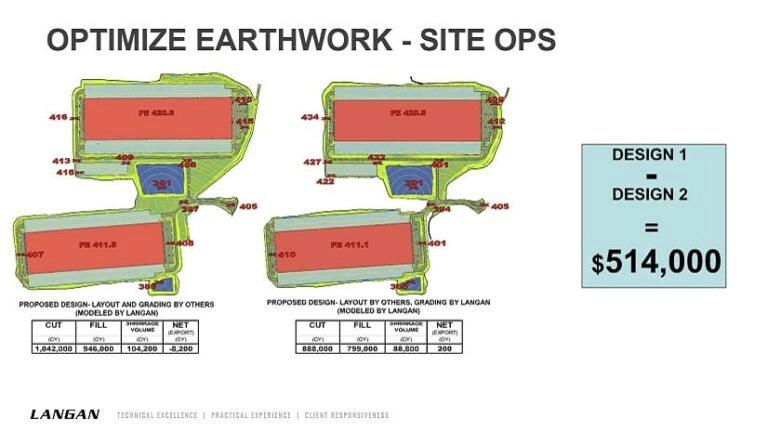 Jednym z najważniejszych czynników kosztowych przy budowie centrum danych jest podłoże. Korzystając z cyfrowego bliźniaka, zespół Langan może ograniczyć wydatki, tworząc plan niwelacji terenu, który wymaga minimalnej ilości prac ziemnych.
