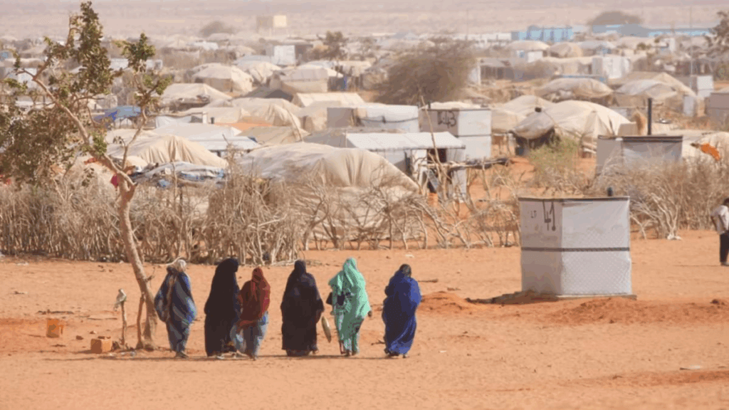 Kobiety w obozie dla przesiedleńców w Mali, gdzie ekstremalne warunki klimatyczne i konflikty zmusiły 344 000 osób do opuszczenia swoich domów na tym dotkniętym suszą obszarze.