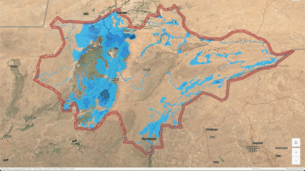 Mapa zasięgu powodzi przedstawia dorzecze rzeki Niger w regionie Mopti w Mali, gdzie protokół wczesnego reagowania na powodzie zapewnił 4‑dniowe wyprzedzenie przed powodziami w 2022 roku. Niebieskie obszary wskazują strefy podatne na zalanie, w których wczesne mapowanie ryzyka pomogło ewakuować 3 045 osób i zabezpieczyć infrastrukturę przed osiągnięciem przez wodę najwyższego poziomu