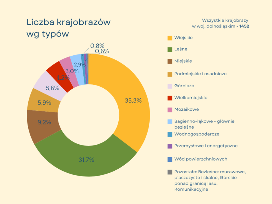 W wyniku przeprowadzonych, wieloaspektowych prac analitycznych na obszarze województwa dolnośląskiego wyznaczono 1452 krajobrazy w 14 typach, w tym wskazano 170 krajobrazów priorytetowych (Rys. 1). Krajobrazy priorytetowe zajmują łącznie niespełna 16% powierzchni województwa. Dla porównania, obecnie obszary chronione w województwie dolnośląskim zajmują 18,7% jego powierzchni (GUS – BDL, 2025). Wśród zidentyfikowanych krajobrazów priorytetowych najliczniej reprezentowane są krajobrazy typu wiejskiego (513) oraz leśnego (460).