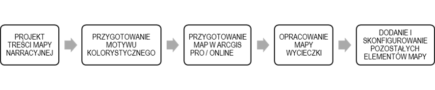 Treść mapy narracyjnej przygotowano tak, aby zawierała najważniejsze informacje dotyczące audytu krajobrazowego, metodyki jego przygotowania oraz — przede wszystkim — jego wyników. Sekwencję głównych etapów prac, tj. opracowanie treści, przygotowanie motywu kolorystycznego, opracowanie warstw tematycznych i map, utworzenie mapy wycieczki oraz zdefiniowanie pozostałych elementów mapy narracyjnej, przedstawiono na rysunku 3.