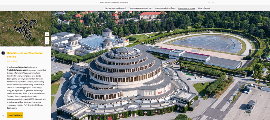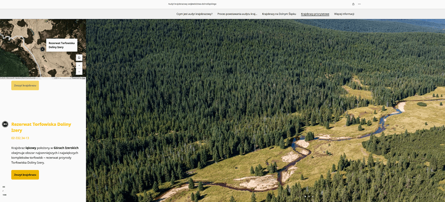 Do opracowania mapy prezentującej krajobrazy priorytetowe województwa dolnośląskiego, zidentyfikowane w toku prac nad audytem krajobrazowym, posłużono się modułem Wycieczki w aplikacji Esri Story Maps. Każdy z krajobrazów priorytetowych stanowi odrębny etap wycieczki, umieszczony na mapie dostępnej w elementach immersyjnych ArcGIS Story Maps. Wykorzystano wariant wycieczki koncentrujący się na treściach multimedialnych.