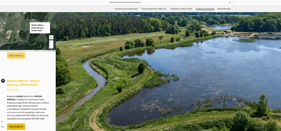 ArcGIS StoryMaps firmy Esri to środowisko, które znacząco wykracza poza tradycyjne pojęcie wizualizacji danych przestrzennych. W kontekście prezentacji audytu krajobrazowego pełni ono rolę nie tylko mapy internetowej, lecz także narzędzia komunikacji, umożliwiającego budowanie spójnej, interaktywnej opowieści o krajobrazie województwa. Taka forma przekazu ułatwia odbiorcom — zarówno specjalistom, jak i mieszkańcom regionu — zrozumienie wartości i znaczenia krajobrazów priorytetowych, a także działań podejmowanych na rzecz ich ochrony i kształtowania.