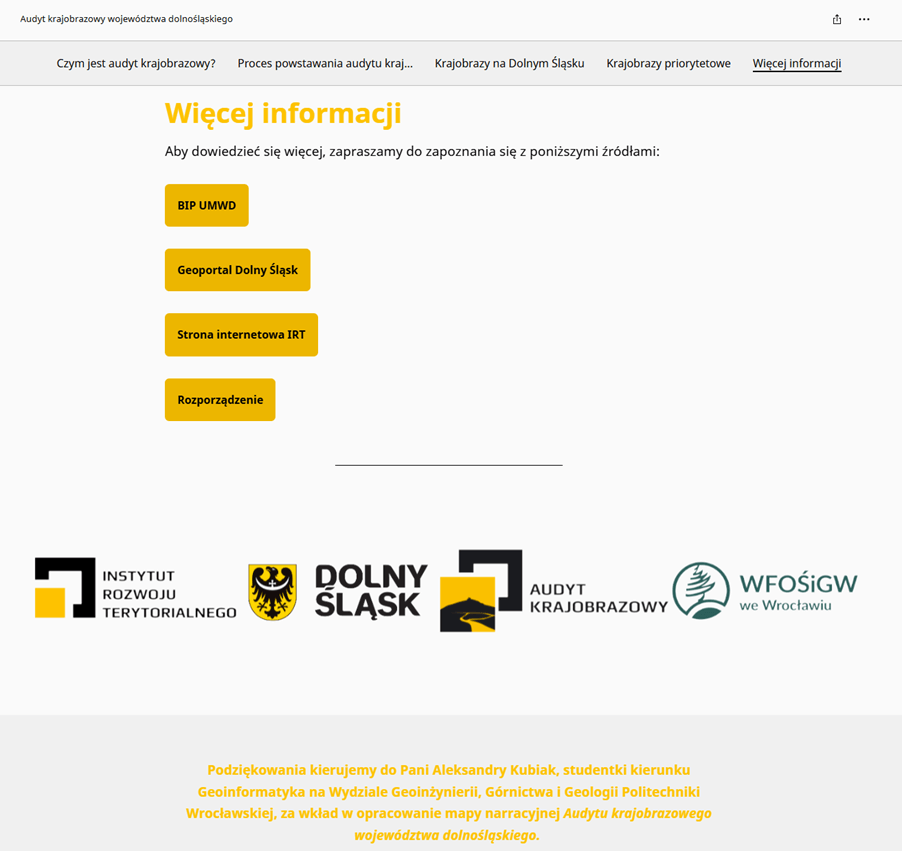 Kubiak A., (2025) Opracowanie Story Map Audytu Krajobrazowego województwa dolnośląskiego. Politechnika Wrocławska, Wydział Geoinżynierii, Górnictwa i Geologii, praca dyplomowa inżynierska