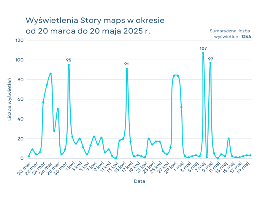 Wykres wyświetleń mapy narracyjnej (Rys. 14) pokazuje wyraźny wzrost zainteresowania aplikacją w terminach prowadzonych spotkań konsultacyjnych. Maksymalna liczba wyświetleń w pojedynczym dniu konsultacji przekraczała 100, a łączna liczba wyświetleń w całym analizowanym okresie wyniosła blisko 1250 unikalnych użytkowników. Pomimo braku działań promocyjnych po zakończeniu konsultacji społecznych mapa narracyjna nadal cieszy się zainteresowaniem i została od tego czasu wyświetlona ponad 900 razy.