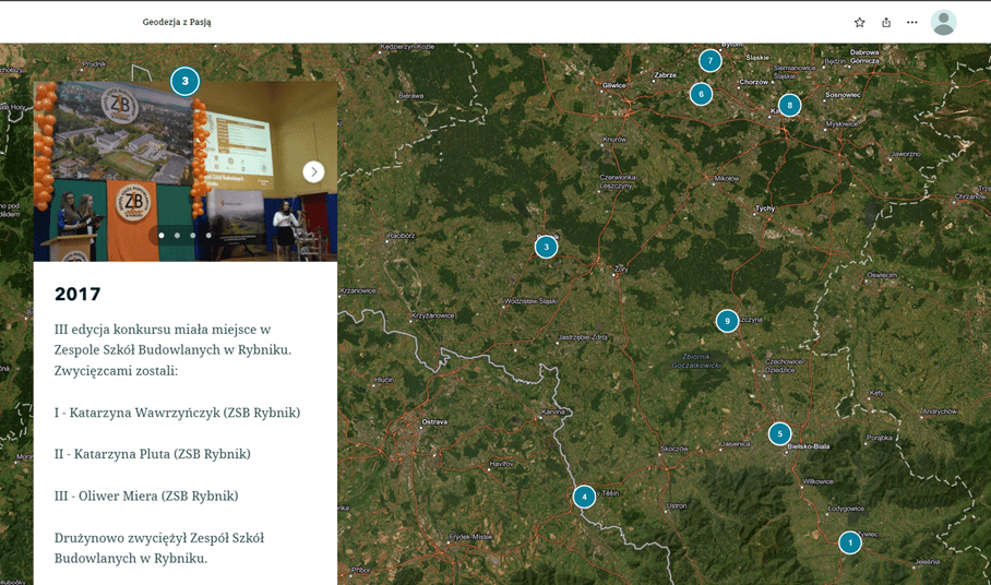 Pomysł na kolejne wykorzystanie oprogramowania ArcGIS zrodził się podczas udziału naszej szkoły w konkursie wojewódzkim „Geodezja z Pasją”. Jedna z uczestniczek zwróciła uwagę, że nikt do tej pory nie zebrał informacji o historii tego wydarzenia – w jakim roku i w której szkole odbywał się konkurs, kto był zwycięzcą i gdzie planowana jest kolejna edycja.