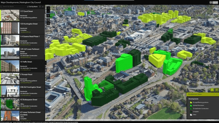 Aby sprostać tym wyzwaniom, Rada Miasta Nottingham opracowała kompleksowy plan rewitalizacji, obejmujący budowę nowych parków, przestrzeni biurowych oraz mieszkań. Kluczowym narzędziem w tym procesie stał się cyfrowy bliźniak 3D, stworzony przy wykorzystaniu technologii ArcGIS Urban oraz innych rozwiązań z zakresu systemów informacji geograficznej (GIS). Cyfrowy model miasta integruje dane przestrzenne, skany budynków oraz informacje planistyczne, wspierając podejmowanie decyzji urbanistycznych. Dzięki temu narzędziu Nottingham pozyskało inwestycje o wartości 4 miliardów funtów oraz obligacje na modernizację miasta.